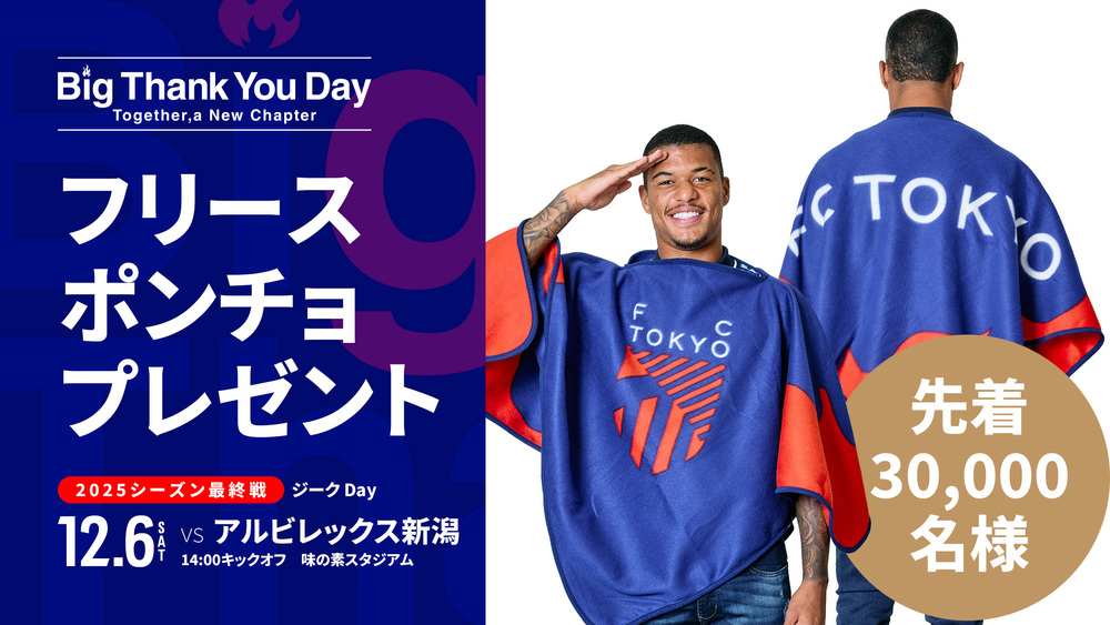 To commemorate the holding of "Big Thank You Day," we will present an original design "Fleece Poncho" to the first 30,000 attendees so that you can warmly and comfortably support this important final match of the season.