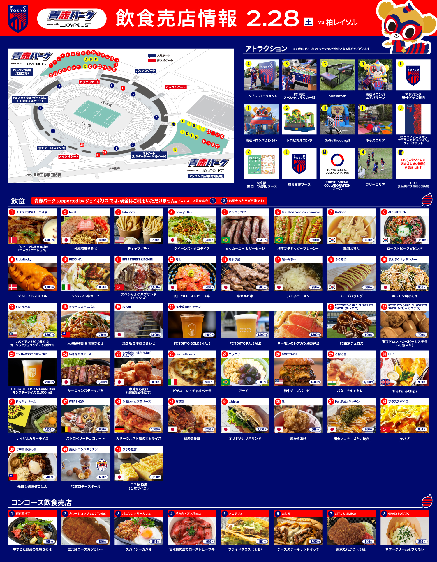 On Saturday, February 28, Meiji Yasuda J1 Century Vision League Sec. 4 vs Kashiwa Reysol (3:00 p.m. kickoff / Ajinomoto Stadium), we will provide food and drink information for AO-AKA PARK supported by Joypolis (outside the stadium), the traveling AO-AKA PARK supported by Joypolis, and the concession stands inside the stadium concourse.