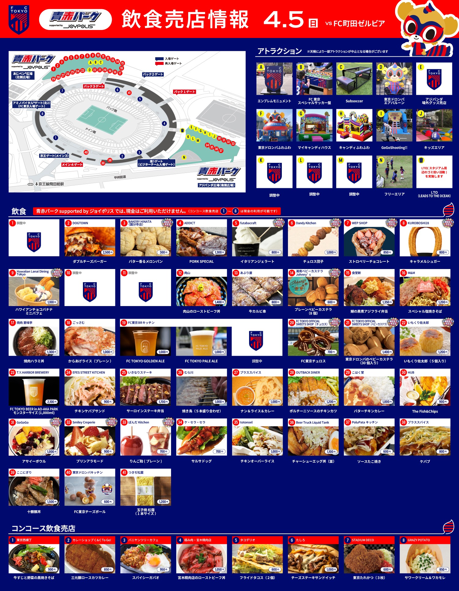 On Sunday, April 5, for the Meiji Yasuda J1 Century Vision League Sec. 9 match vs FC Machida Zelvia (3:00 p.m. kickoff / Ajinomoto Stadium), we are sharing food and drink information for AO-AKA PARK supported by Joypolis (outside the stadium), the traveling AO-AKA PARK supported by Joypolis, and the stadium concourse (inside the stadium) shops.