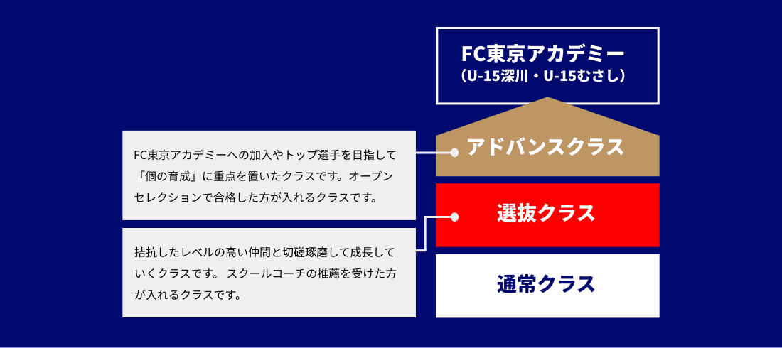 주니어 세대의 최고봉 클래스인 ‘어드밴스 클래스’와 ‘선발 클래스’에서는 FC 도쿄 아카데미의 U-15 후카가와, U-15 무사시는 물론, 장래에 FC 도쿄의 톱팀에서 프로로 활약하는 것을 목표로 개인 육성에 집중한 지도를 실시합니다.