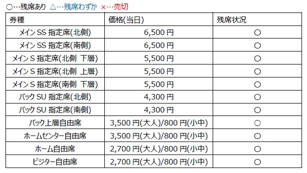 ※バックSB指定席、ホームSG指定席は年間チケットのみの販売となります。前売券、当日券の販売はいたしません。