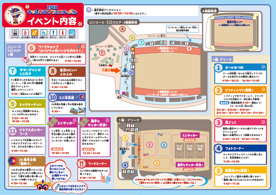 今シーズンも、FC東京を応援してくださっているキッズクラブ会員のみなさまを対象に『2018 キッズクラブフェスティバル』を開催いたします。今シーズンの会場は味の素スタジアムに隣接する「武蔵野の森総合スポーツプラザ」です。日頃の感謝の気持ちを込めて、トップチーム選手とふれあえるアトラクションをはじめ、みなさまにお楽しみいただける企画をご用意してお待ちしております。