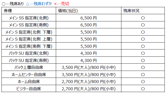 ※バックSB指定席、ホームSG指定席は年間チケットのみの販売となります。前売券、当日券の販売はいたしません。