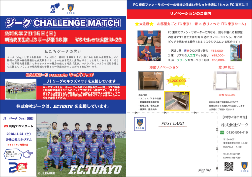 このたびFC東京では、7月15日(日)2018明治安田生命J3リーグ第18節vsセレッソ大阪U-23(17:00キックオフ/味の素フィールド西が丘)において、クラブスポンサーである「株式会社ジーク」のご協賛をいただき、『ジーク CHALLENGE MATCH』を開催いたします。お誘い合わせのうえ、ぜひご来場ください!