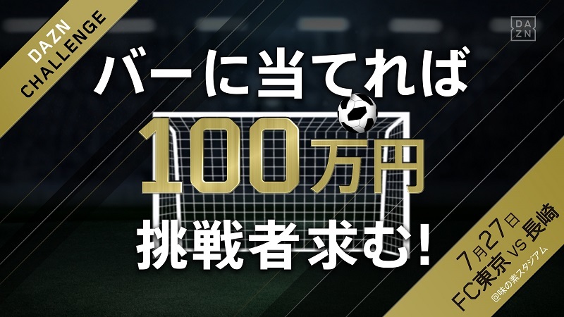 ※「DAZNチャレンジ」とは、所定の場所(ペナルティエリアライン)からボールを蹴り、ゴールのバー(上部)に当てれば成功です。成功すると「100万円」がもらえる超スペシャル企画です!