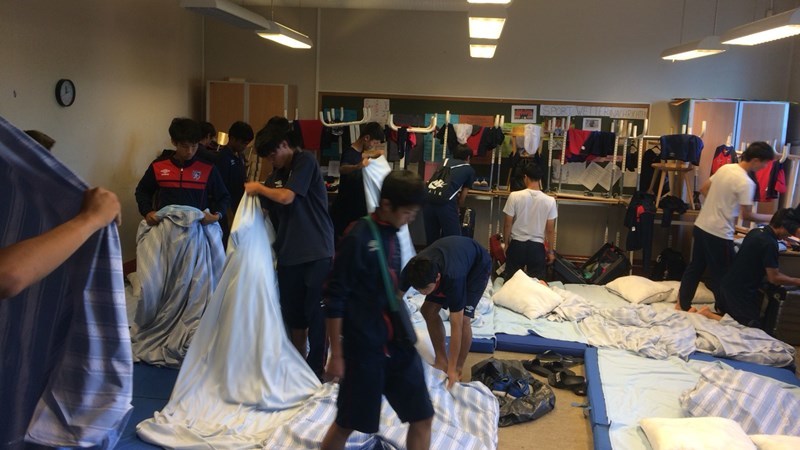 今日から大会期間中の宿舎は、大会側の手配で、地元の学校のひとつの教室にマットレスを敷き、選手、スタッフ全員が共同生活するスタイル。