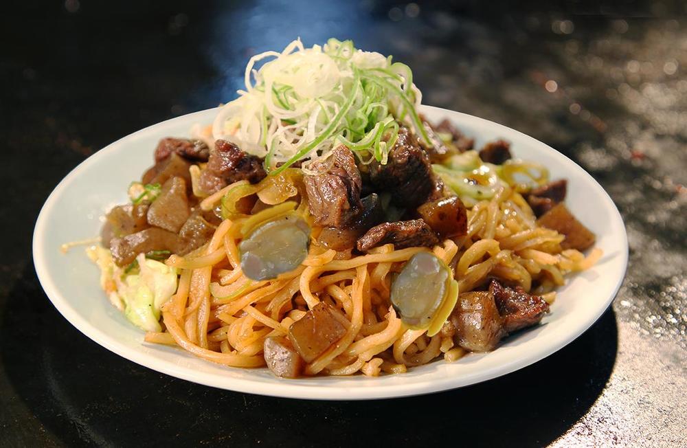 牛すじとこんにゃくを醤油ベースの甘辛い出汁でじっくり煮込んだ、神戸・長田発祥の郷土料理に大粒の海鮮を添えてご案内。香ばしいソース焼きそばに絡まったぼっかけは格別。