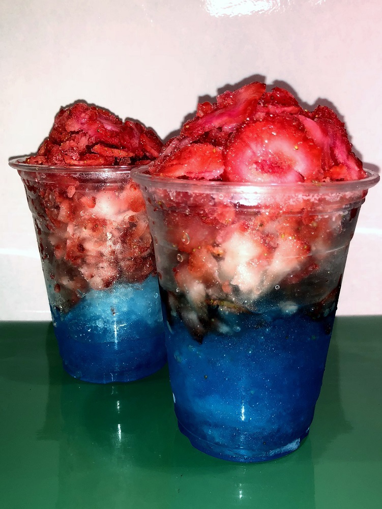 カキ氷にブルーハワイの青色の蜜をかけ、その上に赤いシェイブドストロベリーをのせた冷え冷えスイーツです!FC東京限定バージョンです。