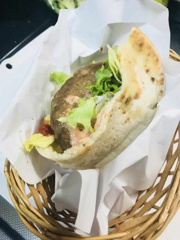 ヘルシーなピタぱんに特製バーグをサンドしました。より肉の味を感じられる逸品です!