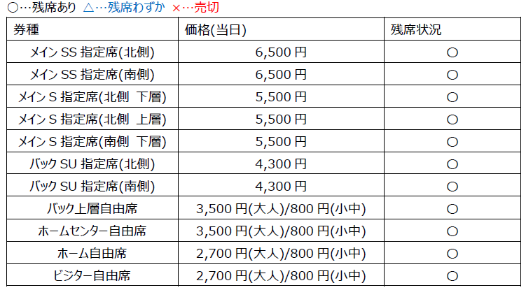※バックSB指定席、ホームSG指定席は年間チケットのみの販売となります。前売券、当日券の販売はいたしません。