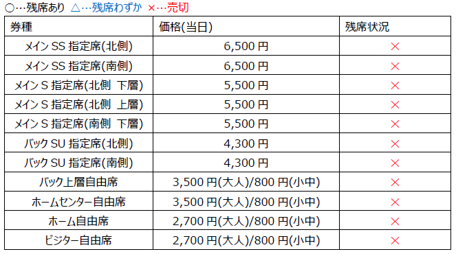 ※バックSB指定席、ホームSG指定席は年間チケットのみの販売となります。前売券、当日券の販売はいたしません。