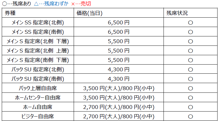 ※バックSB指定席、ホームSG指定席は年間チケットのみの販売となります。前売券、当日券の販売はいたしません。