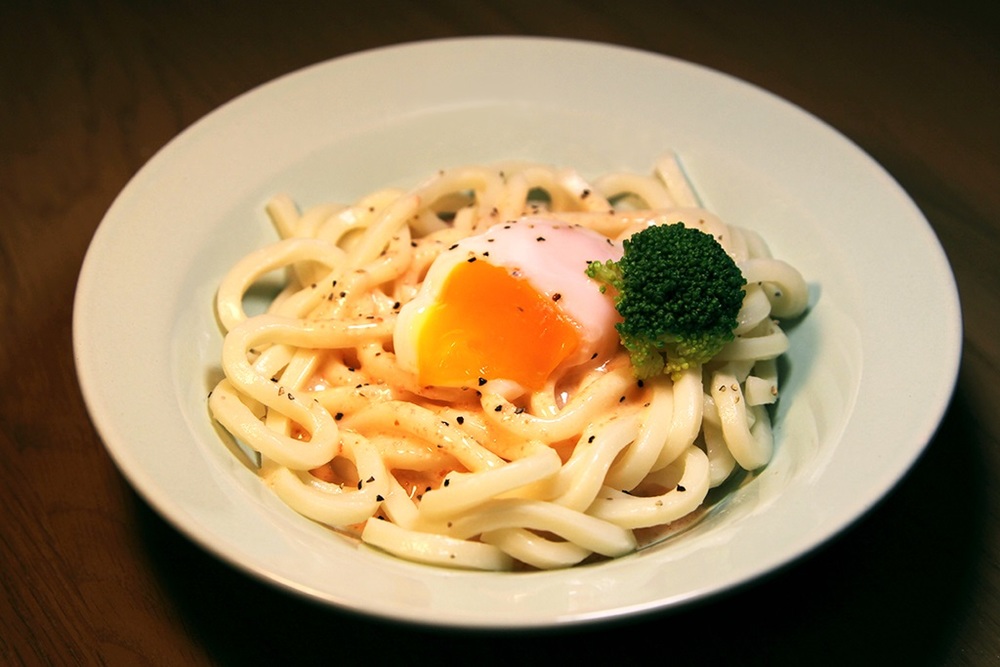 「もっちりコシのある釜揚げ讃岐麺に、とろーり温泉玉子、クリーミーなカルボナーラソースと博多明太ソースが絡む絶品創作うどん」