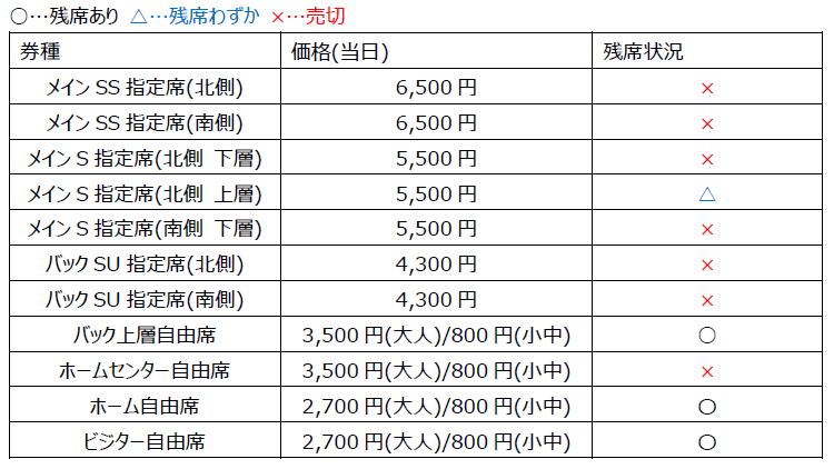 ※バックSB指定席、ホームSG指定席は年間チケットのみの販売となります。前売券、当日券の販売はいたしません。