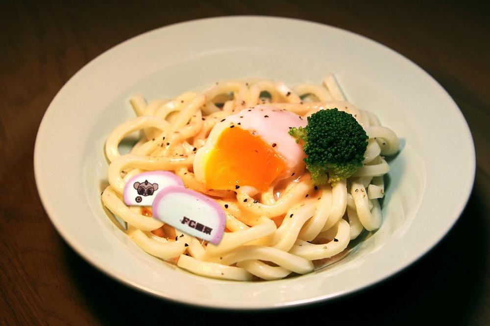 もっちりコシのある釜揚げ讃岐麺に、とろーり温泉玉子、クリーミーなカルボナーラソースと博多明太ソースが絡む絶品創作うどん。今回はFC東京のロゴや東京ドロンパの焼印を添えたかまぼこ入りです。