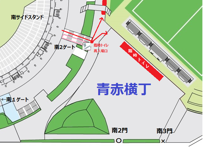 ※南2ゲートは臨時トイレをご利用の方専用の再入場口です。大青赤横丁をご利用の方は、通常通りバック1ゲートでの再入場をご利用ください。