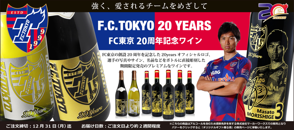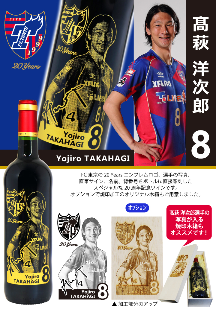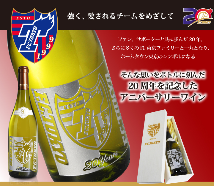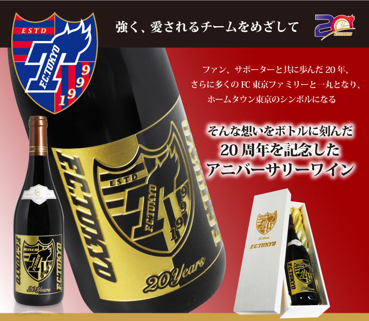 このたび、「FC東京20周年記念ワイン」の販売いたします。FC東京の創設20周年を記念し、エンブレムや選手写真・名前・サインをボトルに直接彫刻した期間限定発売のプレミアムなワインです。