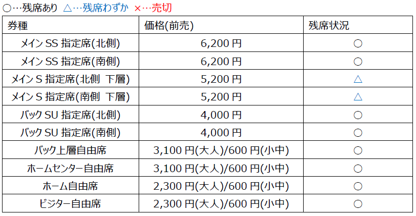 ※バックSB指定席、ホームSG指定席は年間チケットのみの販売となります。前売券、当日券の販売はいたしません。