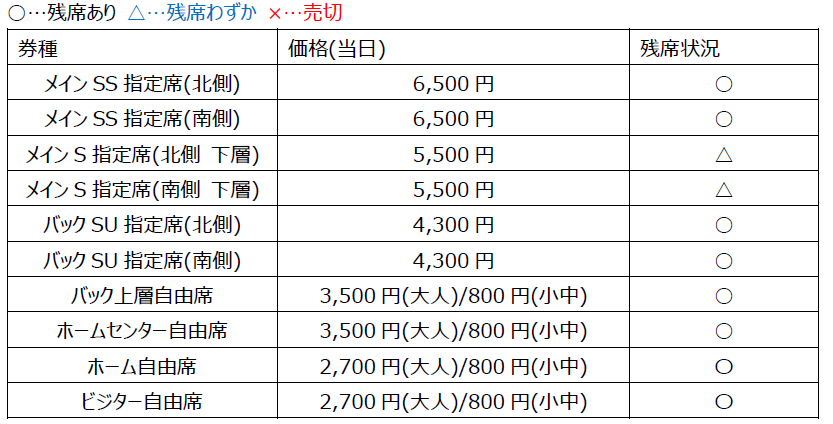 ※バックSB指定席、ホームSG指定席は年間チケットのみの販売となります。前売券、当日券の販売はいたしません。