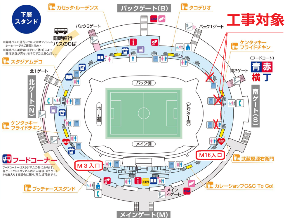 今後も各ホームゲームで改修工事に伴う改修工事エリアが変更しますので、その都度ご確認いただきますようお願いします。