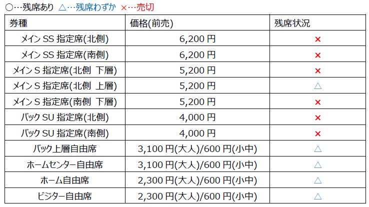 ※バックSB指定席、ホームSG指定席は年間チケットのみの販売となります。前売券、当日券の販売はいたしません。