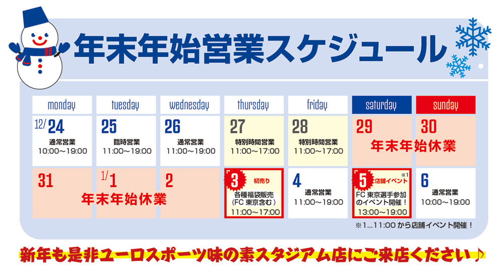 FC東京オフィシャルショップ『ユーロスポーツ 味の素スタジアム店』について、下記日程にて、年末年始休業とさせていただきます。お間違いのないようお願いいたします。