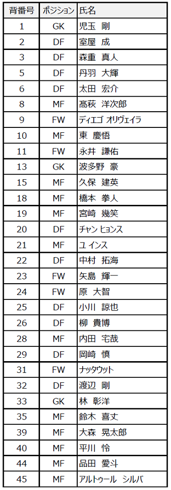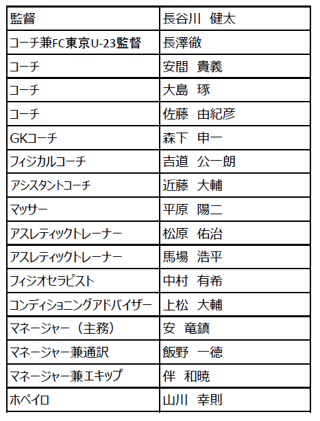 2019シーズンFC東京トップチーム編成について 2019/1/12 トップチーム 2019シーズンのトップチーム編成を下記のとおりお知らせいたします。 【スタッフ】 【選手】 ※コーチの去就について:宮沢正史コーチ→FC東京育成部 ※2018シーズンでクラブを離れたスタッフ:ジョアン ミレッGKコーチ、尾垣孝博トレーナー、石川桂通訳