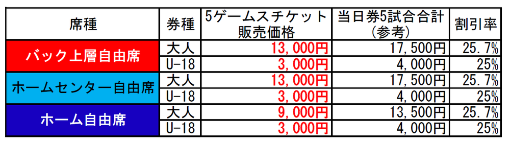 ※消費税率計算の都合上、バック上層自由席(大人)、ホームセンター自由席(大人)は12,999円での販売となります。