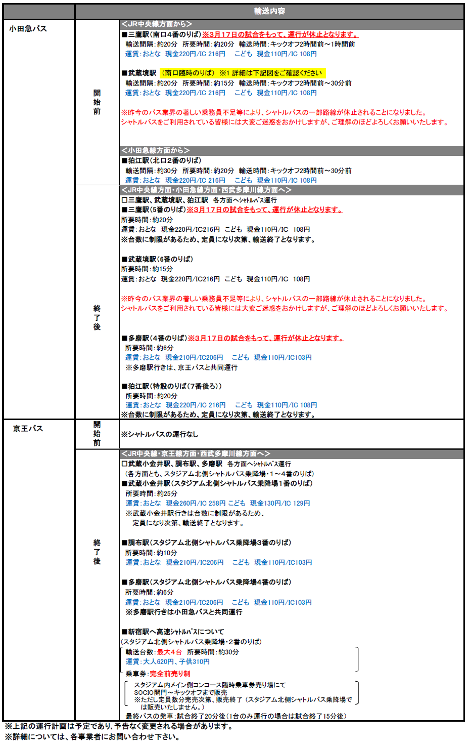 ※小田急バス・吉祥寺駅は試合前・試合後ともに3/10で運行が休止となりました。