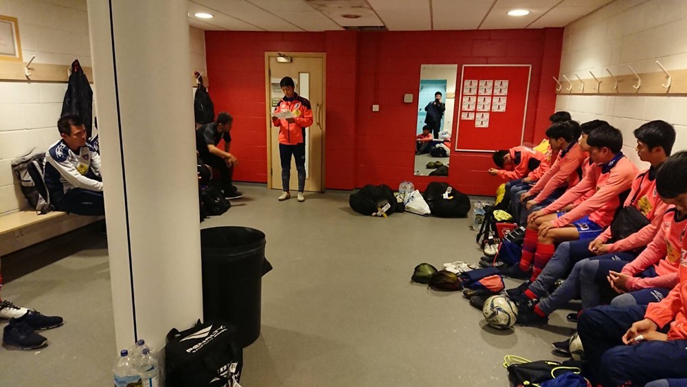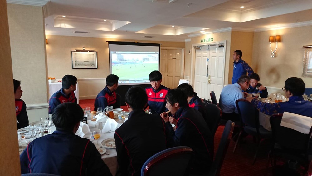 試合前のミーティングでは、中村監督から三浦知良選手の新聞記事の紹介があり「どんな環境もに対応できなければ一流の選手にはなれない」という話がありました。時差ボケや食べ慣れない食事、芝の質感など日本とは全く違う環境だけれど、そこで結果を出さないと本当に強い選手にはなれないという話をし、全員の士気を高めながらグランドへ向かいました。