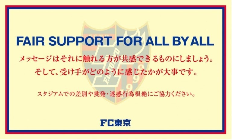 Jリーグ統一禁止事項に「人種、肌の色、性別、言語、宗教、政治または出自等に関する差別的あるいは侮辱的な発言または行為をすること。」を踏まえ、FC東京としましては、2014年9月に『 FAIR SUPPORT FOR ALL BY ALL 』のメッセージを発信し差別や挑発・迷惑行為の根絶に取り組んでおります。
