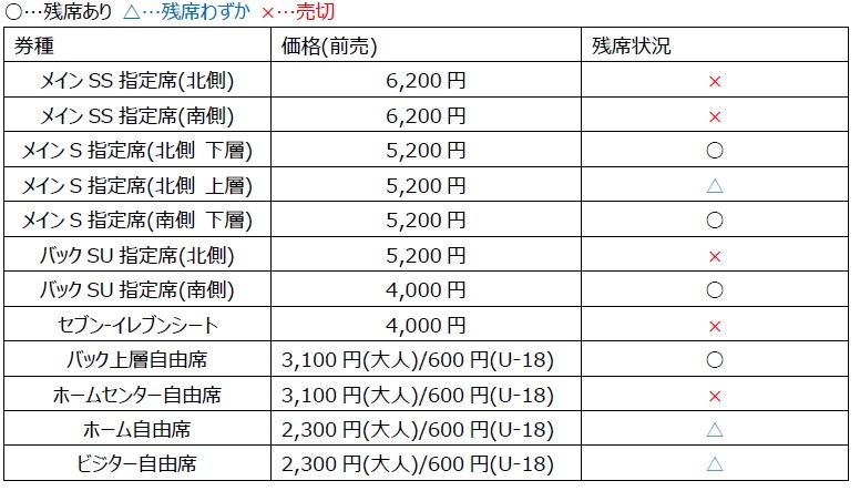 前売りで販売終了となった席種については試合当日場外での販売はございませんので、ご注意ください。