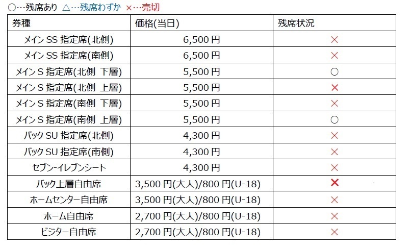 メインSS指定席(北側)、メインSS指定席(南側)、メインS指定席(北側上層)、メインS指定席(南側下層)、バックSU指定席(北側)、バックSU指定席(南側)、セブン‐イレブンシート、バック上層自由席、ホームセンター自由席、ホーム自由席、ビジター自由席は当日券の販売はございません。