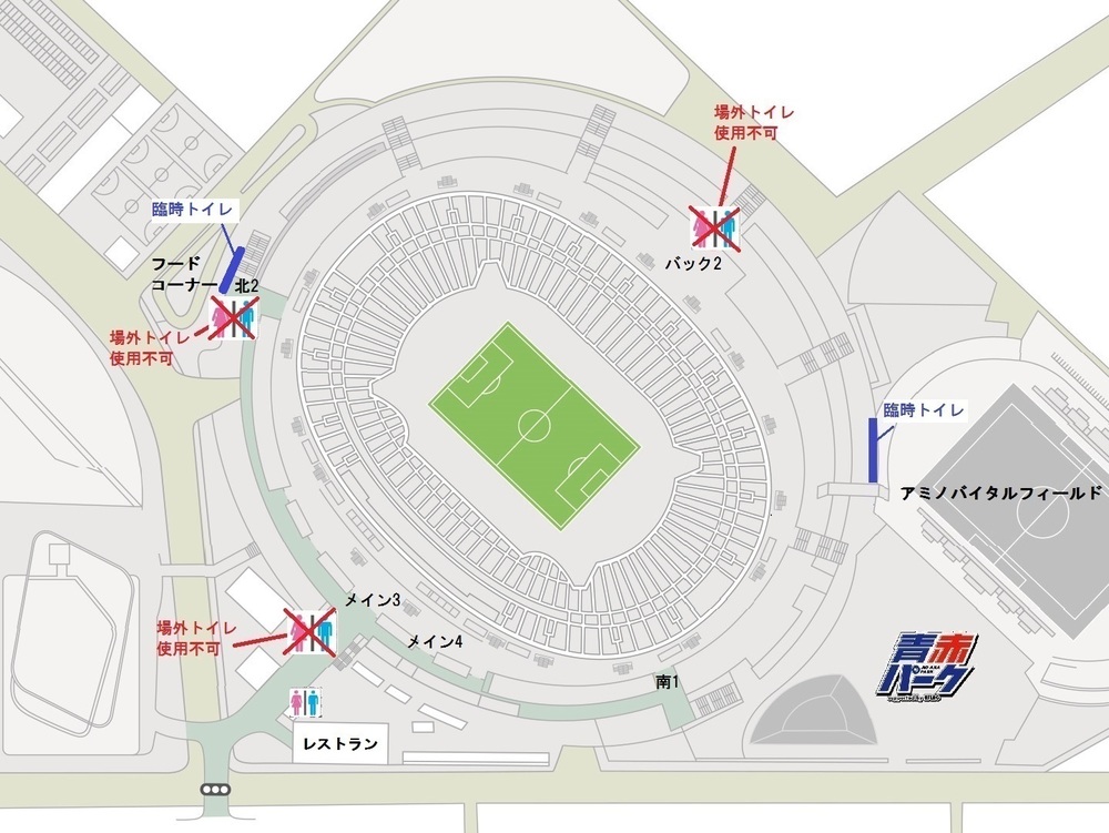 アミノバイタルフィールド付近および北2ゲート場外付近に臨時トイレを設置しております。