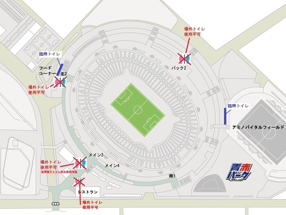 アミノバイタルフィールド付近および北2ゲート場外付近に臨時トイレを設置しております。