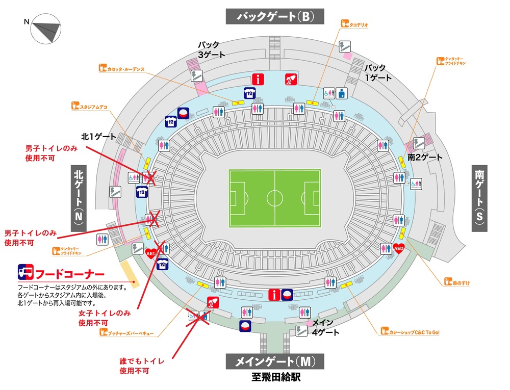 6月1日(土)大分トリニータ戦では、味の素スタジアムの場内トイレの一部が改修工事のため使用できません。