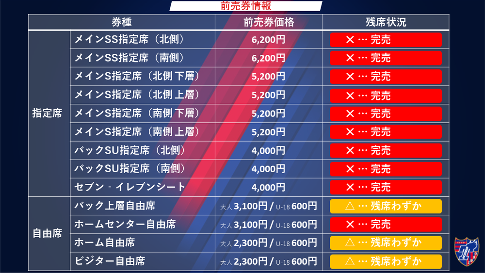 6/15(土)2019明治安田生命J1リーグ第15節vsヴィッセル神戸戦(19:00キックオフ/味の素スタジアム)の前売券販売について、下記のとおりご案内いたします。