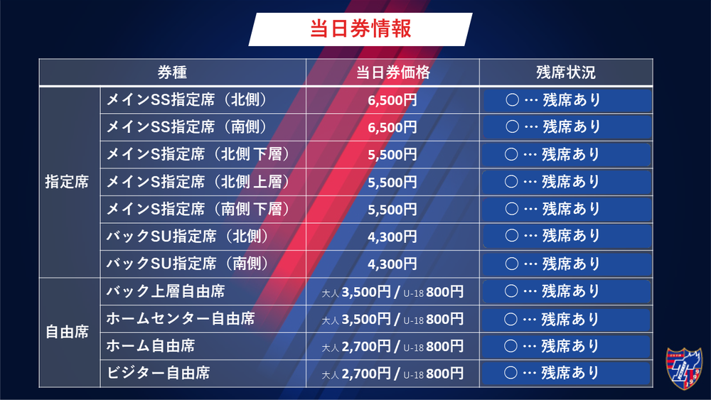 ※FC東京応援エリア(各指定席ホーム側、バック上層自由席ホーム側、ホームセンター自由席、ホーム自由席)内でビジターチームの応援は一切できません。