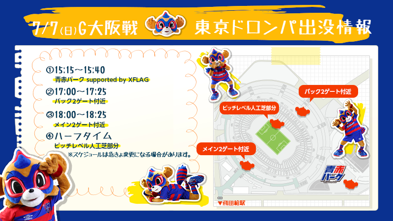 7/7(日)2019明治安田生命J1リーグ第18節vsガンバ大阪(19:00キックオフ/味の素スタジアム)に東京ドロンパが下記の通りあらわれます。ぜひ、「東京ドロンパ」に会いにきてください!!お楽しみに!