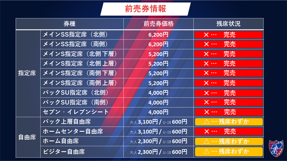7/14(日)2019明治安田生命J1リーグ第19節vs川崎フロンターレ戦(19:00キックオフ/味の素スタジアム)の前売券販売について、下記のとおりご案内いたします。