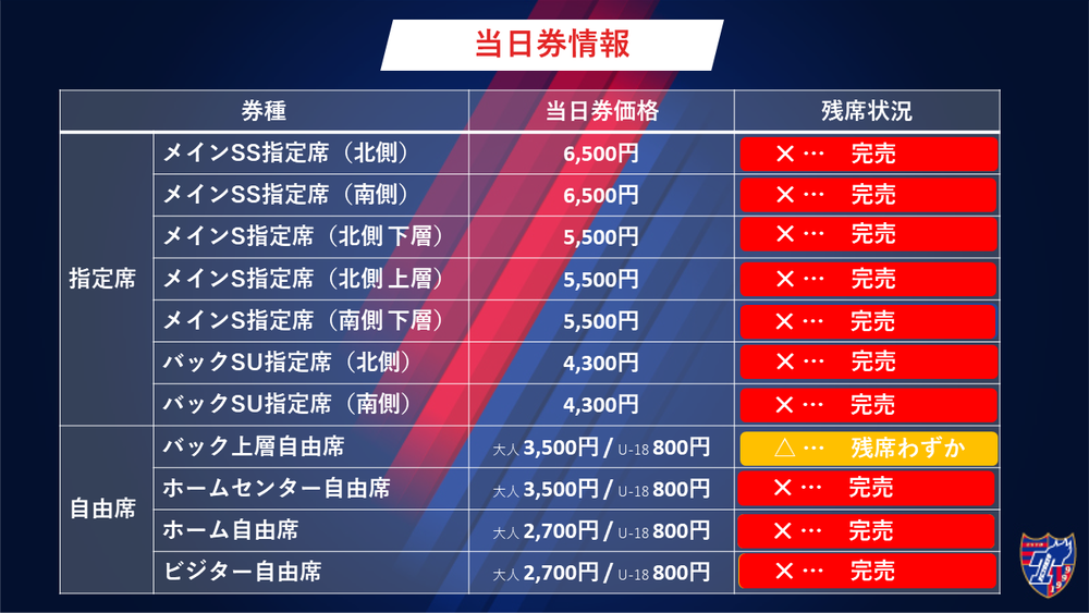 7/14(日)2019明治安田生命J1リーグ第19節vs川崎フロンターレ戦(19:00キックオフ/味の素スタジアム)の当日券販売について、下記のとおりご案内いたします。