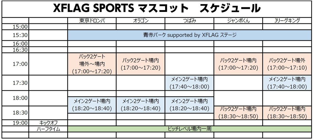 (1)15:30~16:00 → 「青赤パーク supported by XFLAG」ステージ(東京ドロンパ、オラゴン、つばみ、ジャンボくん、Jリーグキング)