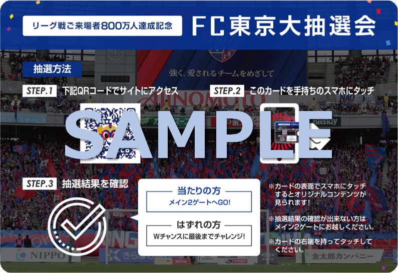 また、Jリーグ通算来場者数800万人達成を記念した、「FC東京大抽選会」を実施いたします。Wチャンスもご用意しておりますので、ぜひ「チャレンジ」してください!