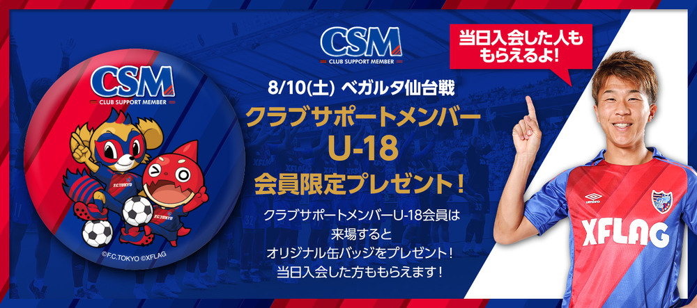 8月10日(土)明治安田生命J1リーグ第22節ベガルタ仙台戦(19:00キックオフ/味の素スタジアム)にて、クラブサポートメンバーU-18会員の方を対象に〈F.C.TOKYO×XFLAG〉オリジナル缶バッジをプレゼントいたします。この試合までにご入会いただいている方だけでなく、当日ご入会いただいた方も対象となりますので、18歳以下でクラブサポートメンバーにご入会されていない方は、ぜひこの機会にご入会ください。
