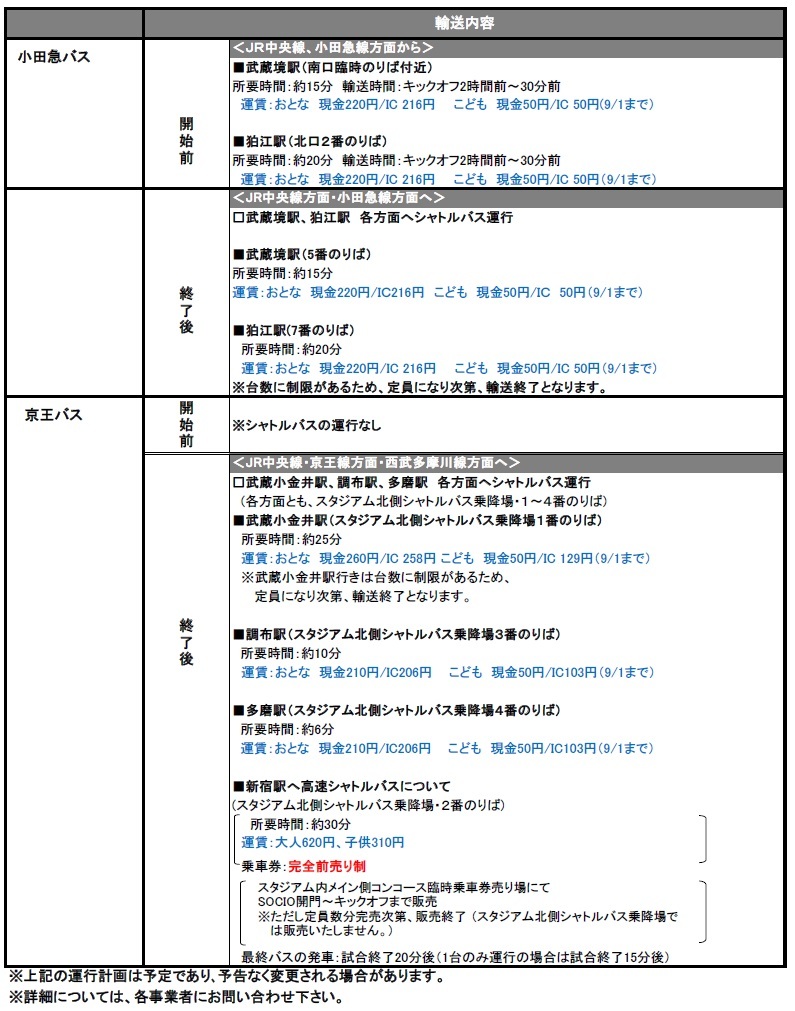 8/3(土)2019明治安田生命J1リーグ第21節vsセレッソ大阪(19:00キックオフ/味の素スタジアム)にて運行されるシャトルバス・路線バスについてご案内いたします。