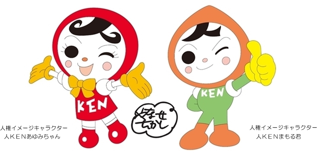 人権擁護委員が、法務省人権イメージキャラクターの「人KENまもる君」、「人KENあゆみちゃん」とともに、東京ドロンパとのコラボデザインのランドリーバッグや人権啓発グッズを配布します。
