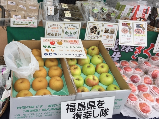 ふくしまフルーツシューやジャンボカジキメンチなど、福島県のおいしい特産品を販売します。