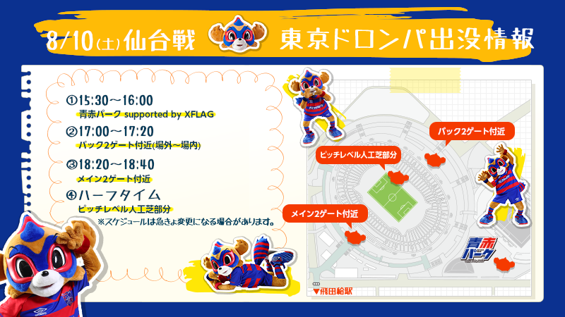 8/10(土)2019明治安田生命J1リーグ第22節vsベガルタ仙台(19:00キックオフ/味の素スタジアム)に東京ドロンパが下記の通りあらわれます。ぜひ、「東京ドロンパ」に会いにきてください!!お楽しみに!