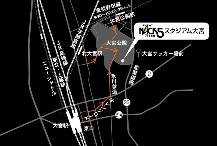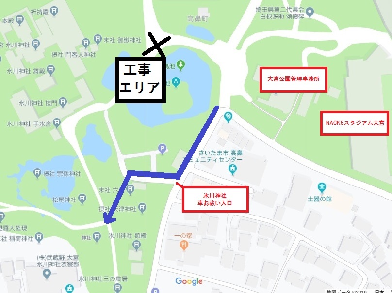 それに伴い、試合終了後に大宮駅方面へ向かう皆さまにおいては「大宮公園管理事務所横」を通行し「氷川神社 車お祓い入口」から氷川神社敷地内を通行するルートのご利用をお願いいたします。