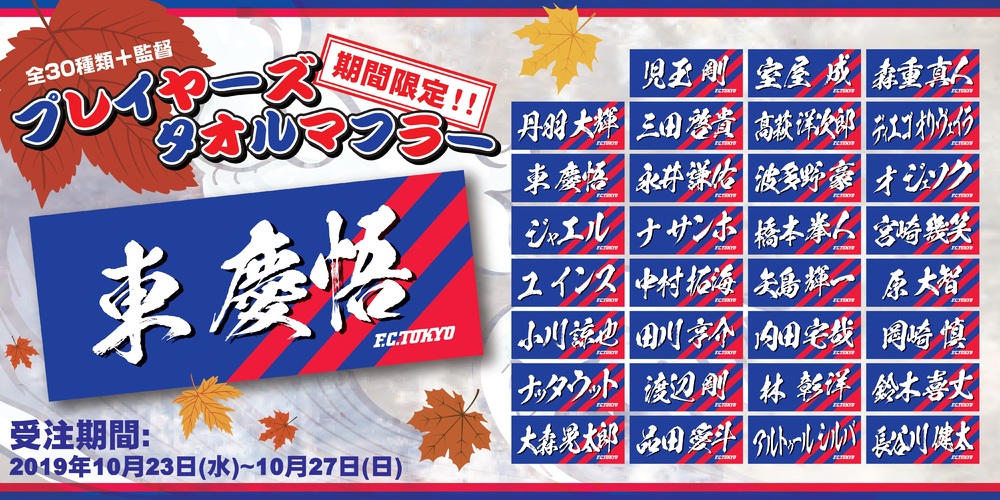 「プレイヤーズタオルマフラー」を予約販売いたします。完全受注生産となりますので、お気に入りの選手をお買い求めのうえ熱い応援をお願い致します!